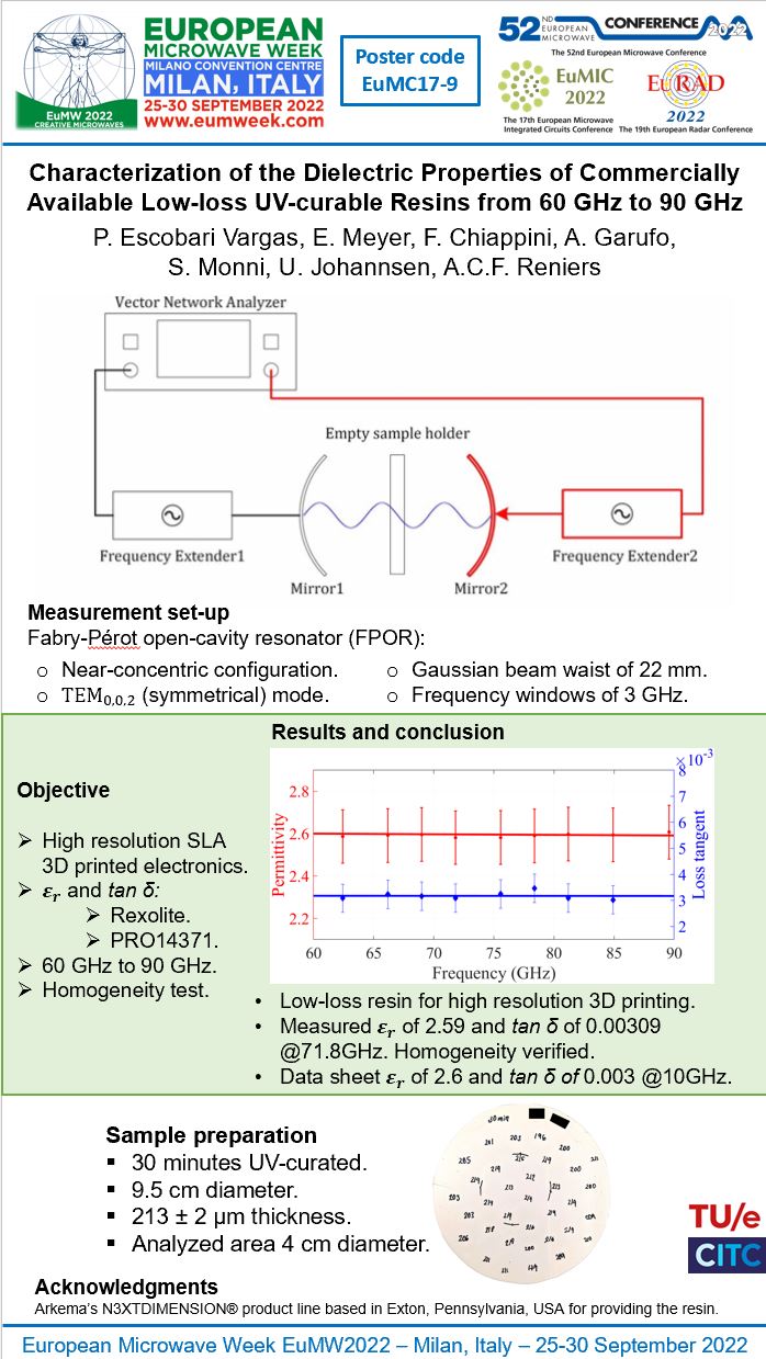 October 26, 2022 – At the recently held European Microwave Week conference in Milan, our colleague Paola Escobari successfully presented her work on the characterization of the dielectric properties of commercially available low-loss UV-curable resins from 60 GHz to 90 GHz.